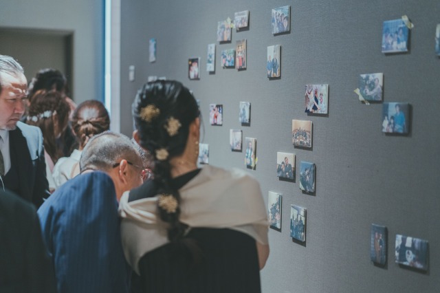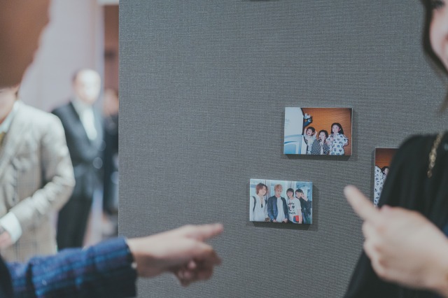 廊下の壁に幼い頃の写真やゲストと撮った写真を