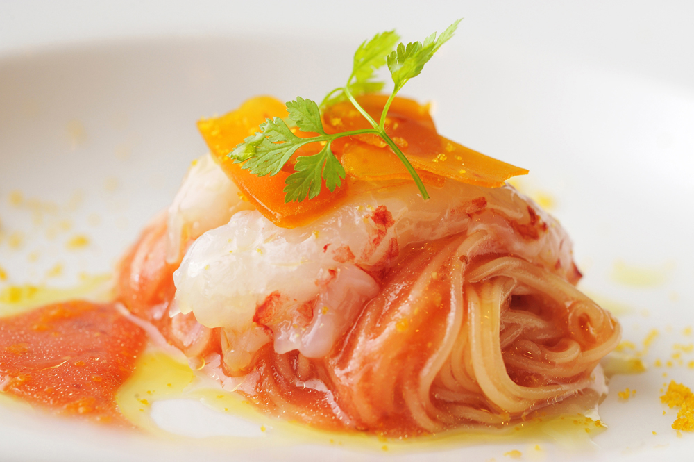 植竹シェフのスペシャリテ「薩摩たか海老とフルーツトマトの冷製カッペリーニ」です!