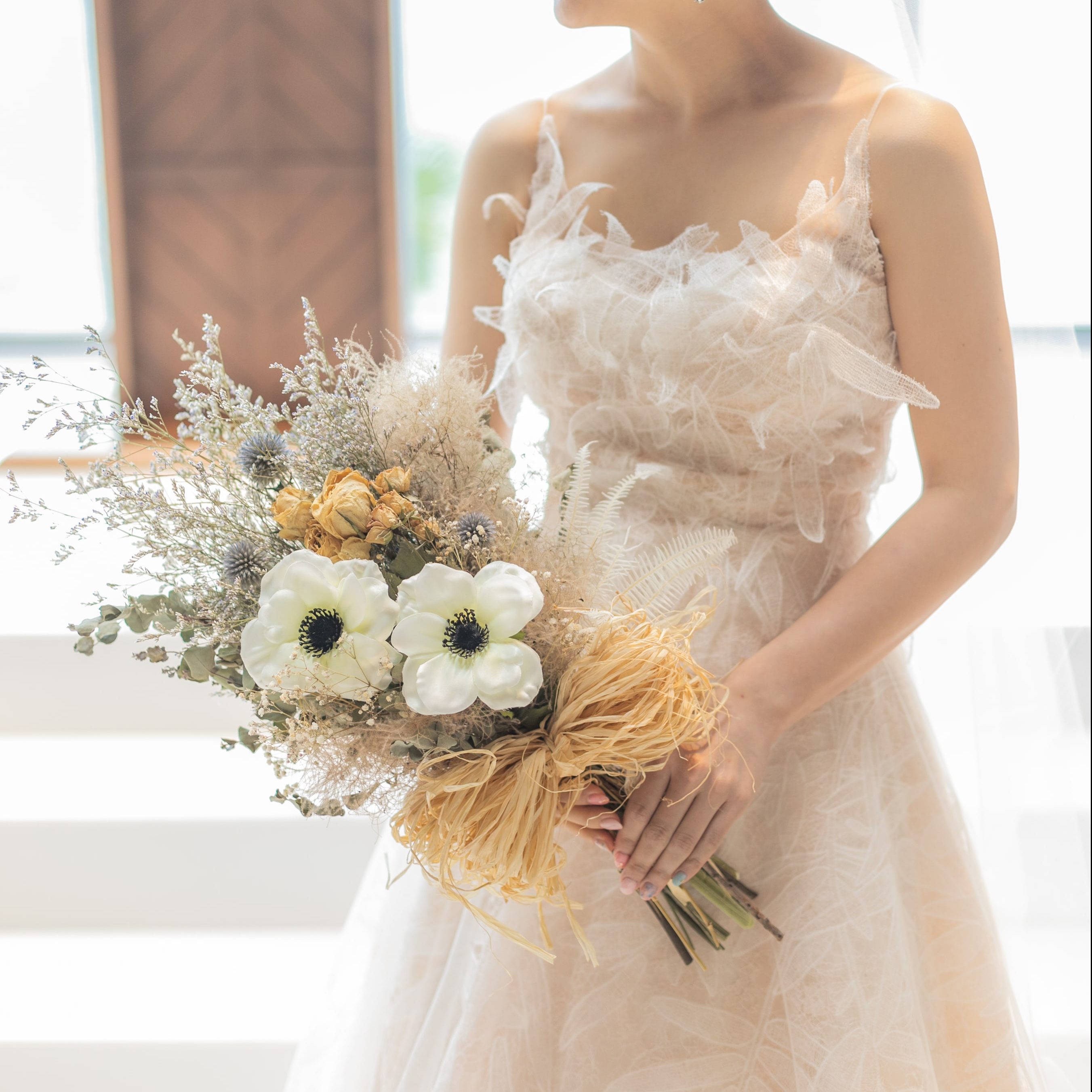 ドレスの形に合わせておふたりのオリジナルブーケを作り上げます❀