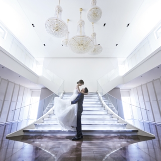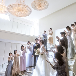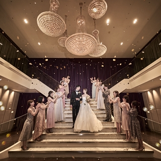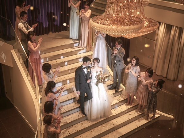 チャペルの扉の先にあるのは、豪華なシャンデリアと光に包まれた大階段のあるセレモニースペース。幻想的なライティングの下、ゲストの方々と思いのままのアフターセレモニーが叶います。感動と祝福の笑顔が交差する、優雅なひと時をお過ごしください。