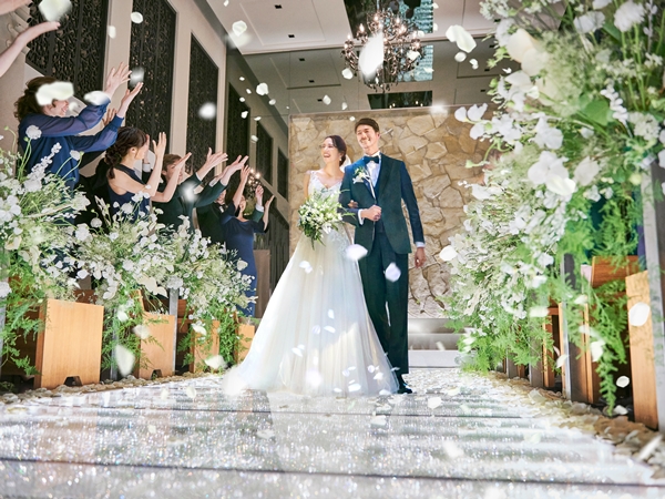無数に敷きつめられたストーンが足元で繊細に煌めき、まるで天空を歩いているかのような透明感にあふれたバージンロード。光の輝きがおふたりを美しく照らし出し、花嫁姿をより一層引き立たせます。また、チャペルの椅子は着物の方でも座りやすいよう幅が広くゆったりした造りになっており、挙式中もゲストの皆さまに快適にお過ごしいただけます。