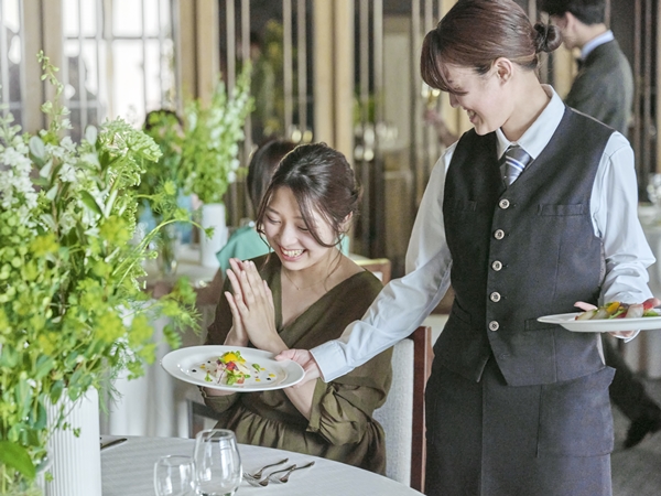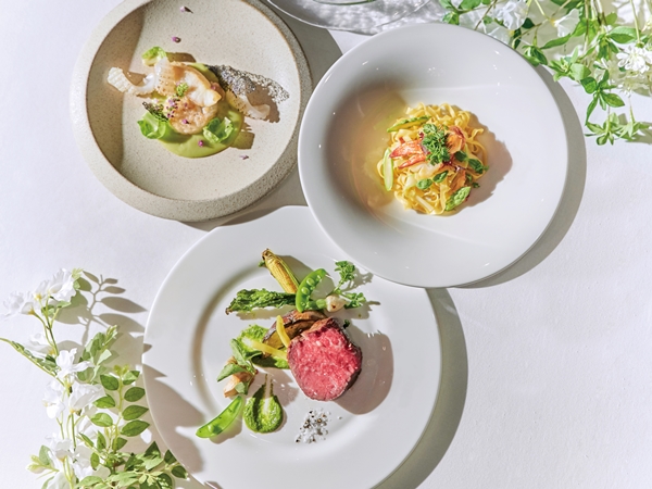 また、食材、味、見た目、食べやすさ。 プロならではの提案で、 おふたりのお気に入りの食材や一品を加えておふたりらしいメニューでおもてなしいたします。