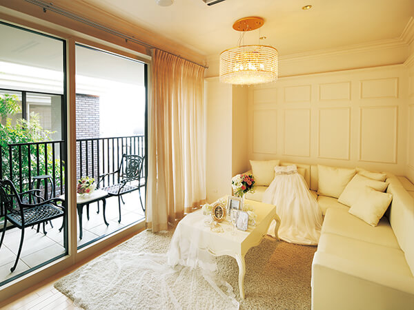 優雅な気分でお支度をしていただけるよう、ブライズルームはゆとりのある上質なお部屋をご用意しております。挙式前の緊張をほぐし、リラックスしたひと時をお過ごしください。