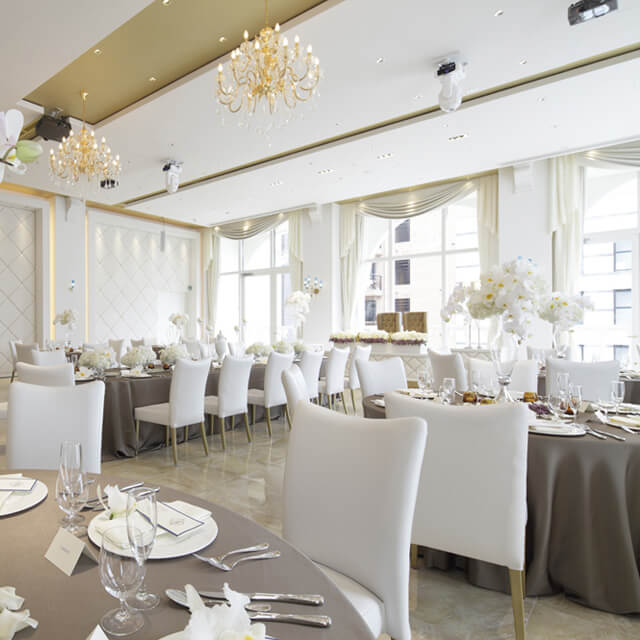 白を基調にした明るいバンケット「アッズーロ」。パーティーの主旨に合わせて、空間を自由にアレンジしやすいのが特徴です。ご宴会はもちろん、会議や展示会などのビジネスシーンにもご活用いただけます。