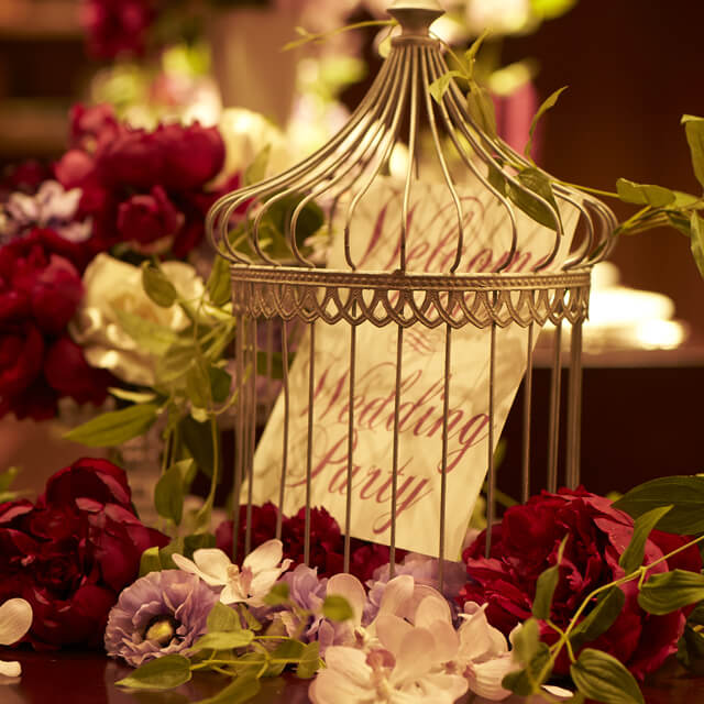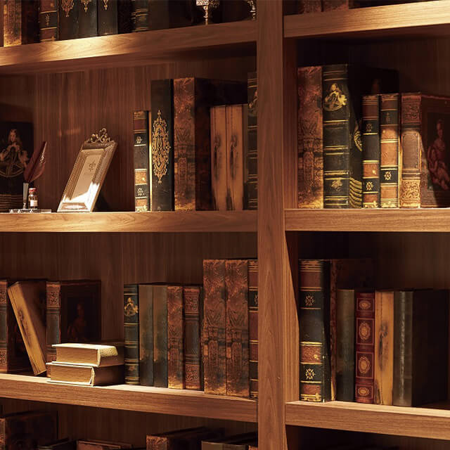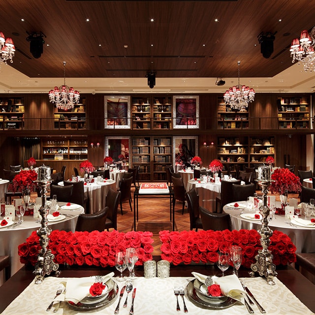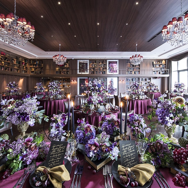 邸宅の書斎をイメージしたバンケット「ルビーノ」。ウッディな調度品を配した重厚かつ遊び心あふれる空間が、上質であたたかいパーティーを演出します。大勢で愉しむ賑やかなパーティーからフォーマルなイベントまで幅広く対応できます。