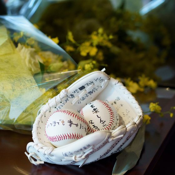 挙式では誓いの言葉で父とキャッチボールの演出や披露宴では、オープニングムービーから続けてプロジェクションマッピングやフラワービュッフェなどをしました!