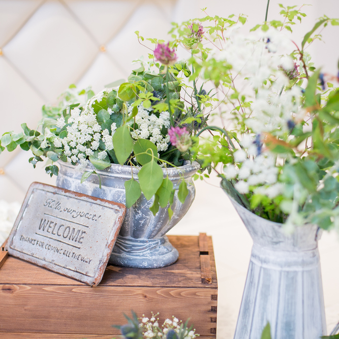 「任せてください!」と、イメージ通りの高砂席と、私たちが持ち込んだブリキの容器を使って各テーブルを飾ってくださいました。