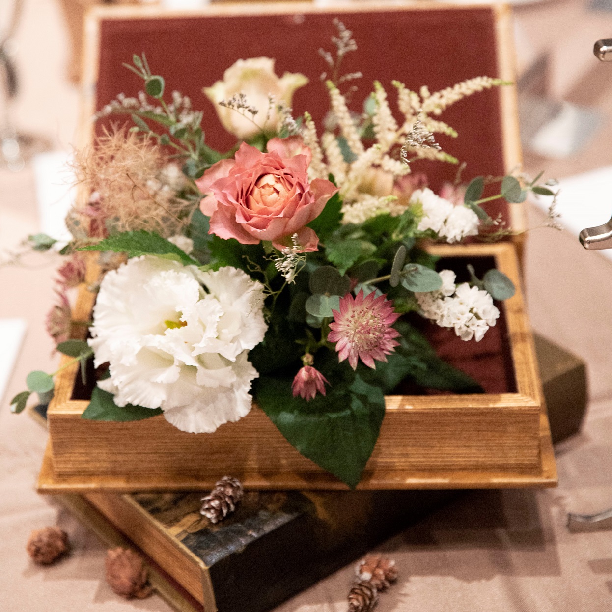 次にこだわったポイントは会場等の装花です。ゲストの皆様にルビーノの会場の雰囲気を存分に楽しんでもらいたいという気持ちがあったので、会場の本棚に合うように、少しアンティークな色味のお花と会場の本も使ってもらい華やかな空間を演習して頂きました。お花の色味などにこだわって装花をお願いしたのですが、ゲストの方々から『お花の色が可愛すぎる!』と感想をいただき、たくさんのお花を持って帰ってくれたようでとても満足しています!
