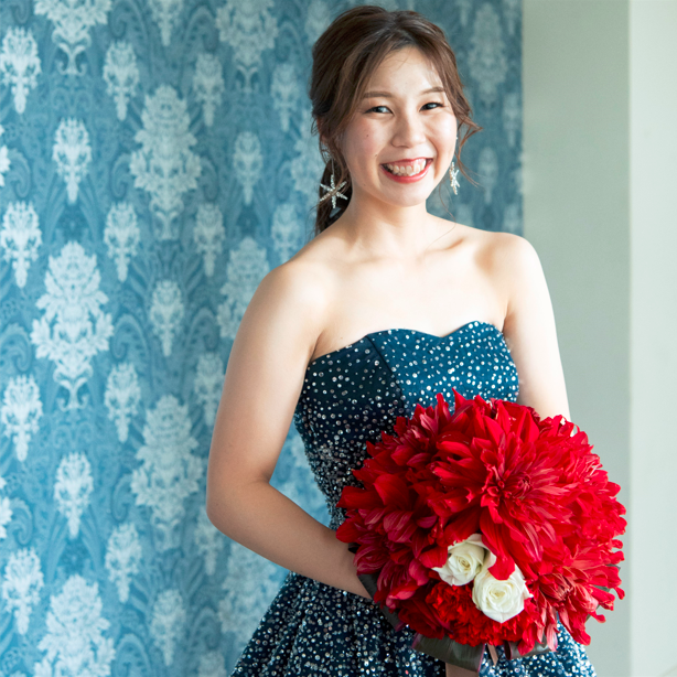 コロナ禍での結婚式でありながらも集まってくださったゲストの方々にも、退屈せず楽しんでもらえて、一緒に参加できるように考えました。挙式は人前式だったのでウエディングドロップスを、また、披露宴ではカラードレス当てクイズをしました。そして、テーマであるインパクトもこだわり、記憶に残る結婚式にしました!