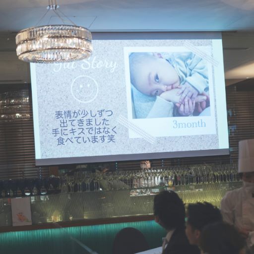 アットホームにこだわってレストランを選びました。娘と一緒だったので、進行内容はゆとりを持った内容にしました。当日、写真を撮る時間やテーブルごとにゆっくり話す時間も取れたので良かったと思っています。料理ではメイン料理でお肉を2種類、ドルチェでは無理を言って3種類用意していただきました。娘にスペシャル離乳食を用意してもらい、食べているところをみなさんに披露する場面やファーストバイトで娘から姉妹にの場面も設けてもらいました。