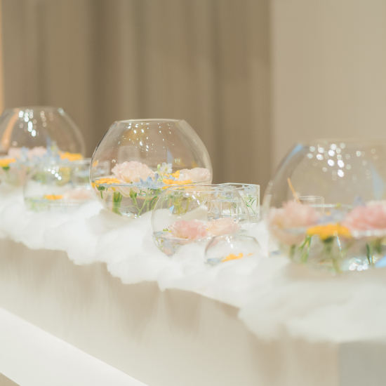 ほとんどの打ち合わせをリモートで進めてきましたが,画面越しでも笑顔で相槌をうってくださるので話していてとても心地がよく、毎回の打ち合わせを楽しみにしていました。当日の朝は、半年間準備をしてきた日がついにきたというワクワクと、今日で終わってしまうのだというさみしさが入り混じっていましたが、はじまるとチャペルでの親族紹介式からお見送りまで、人生で一番あっという間の一日でした。その中でも一番に印象に残っているのはゲストの皆様の笑顔です。ウェルカムスピーチでゲストの皆様に向かい合ったとき、コロナ禍にも関わらず今まで二人を支えてくれた大事な方々が集まってくださっている光景に感動しました。会場中が笑顔で溢れていて、私たちもずーっと口角上がりっぱなしの目尻下がりっぱなしでとても幸せな時間を過ごすことができました。