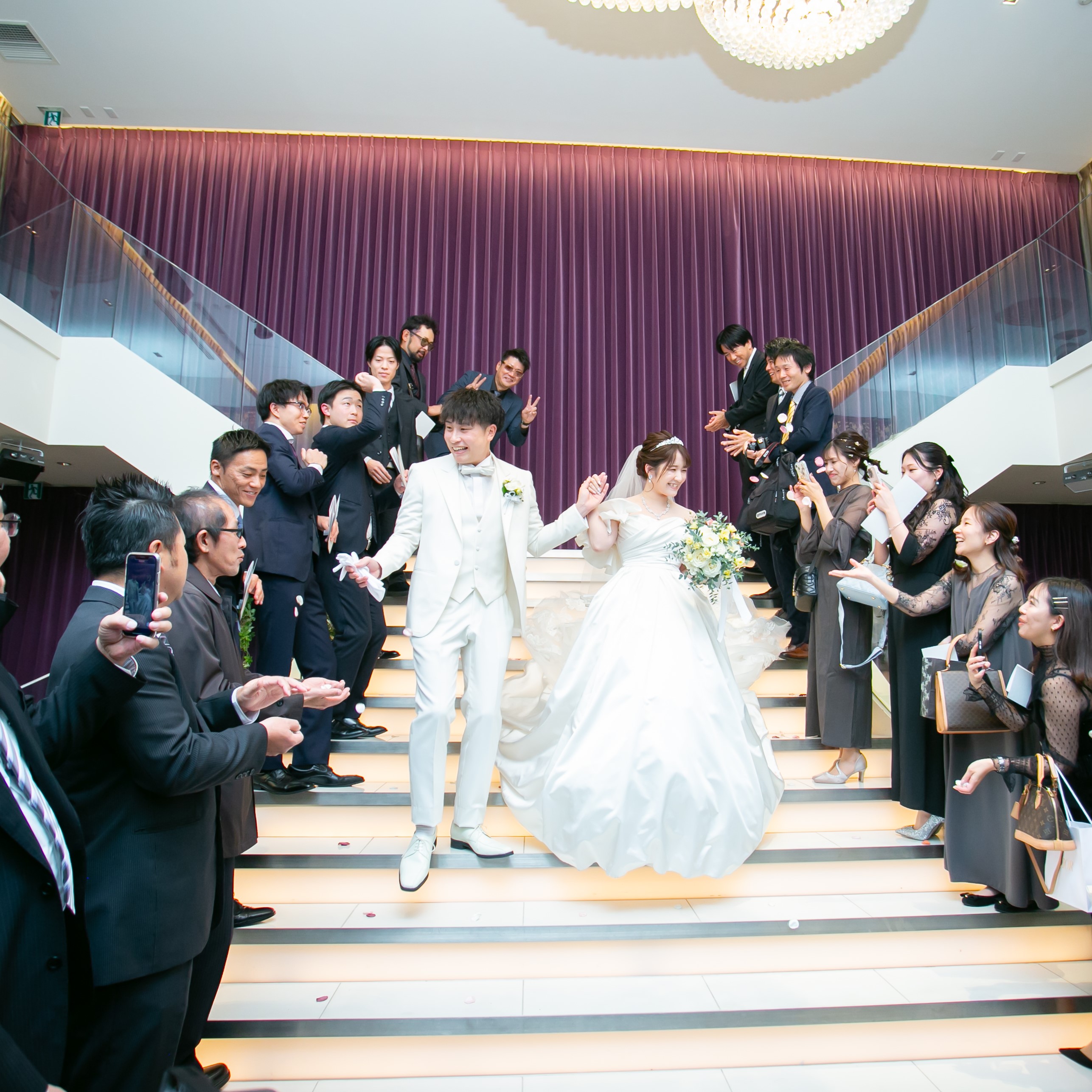 マジックウォールやプロジェクションマッピングなどの映像関係がすごくクオリティが高かったので、自分たちならではの演出ができそうと思った。県外からの参列者もいたため立地が良かったところにひかれた。挙式会場・披露宴会場の雰囲気が好きだった(白をイメージしていたので)。階段があるアフターセレモニーに憧れていたので、叶えれるところにひかれた。
