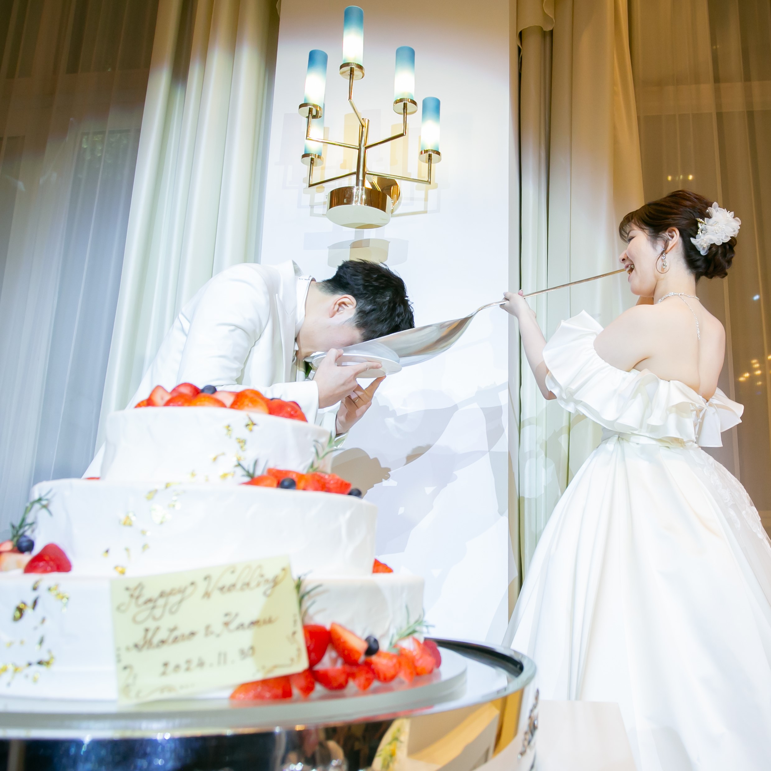 準備からがあっという間に過ぎていって、楽しかった思い出です。宿題となるとギリギリにしてしまっていたので、早く取り掛かれば、、と後悔もありますが周りから「いい式だったよ」と言って貰えて思い出に残る式になったと思う。BGMやお花、ケーキなど各1回ずつの打ち合わせだったのがイメージを伝えられたか当日まで不安でしたが、クオリティが高いものを作っていただいていたのですごく良かったと思います。親戚、友達、会社関係みんなが楽しめる式にできたと実感しています。