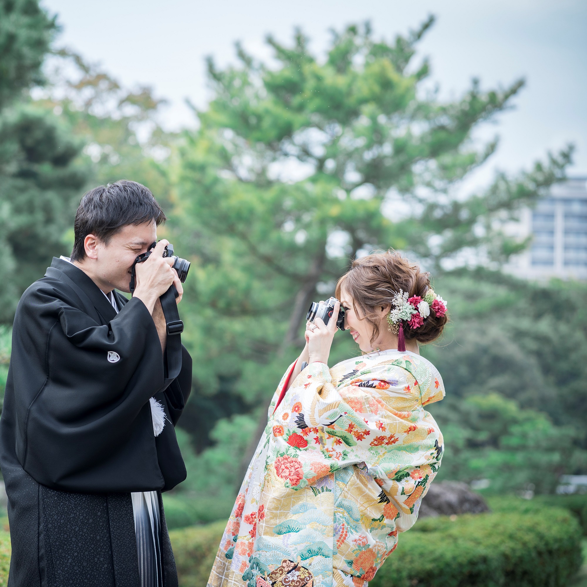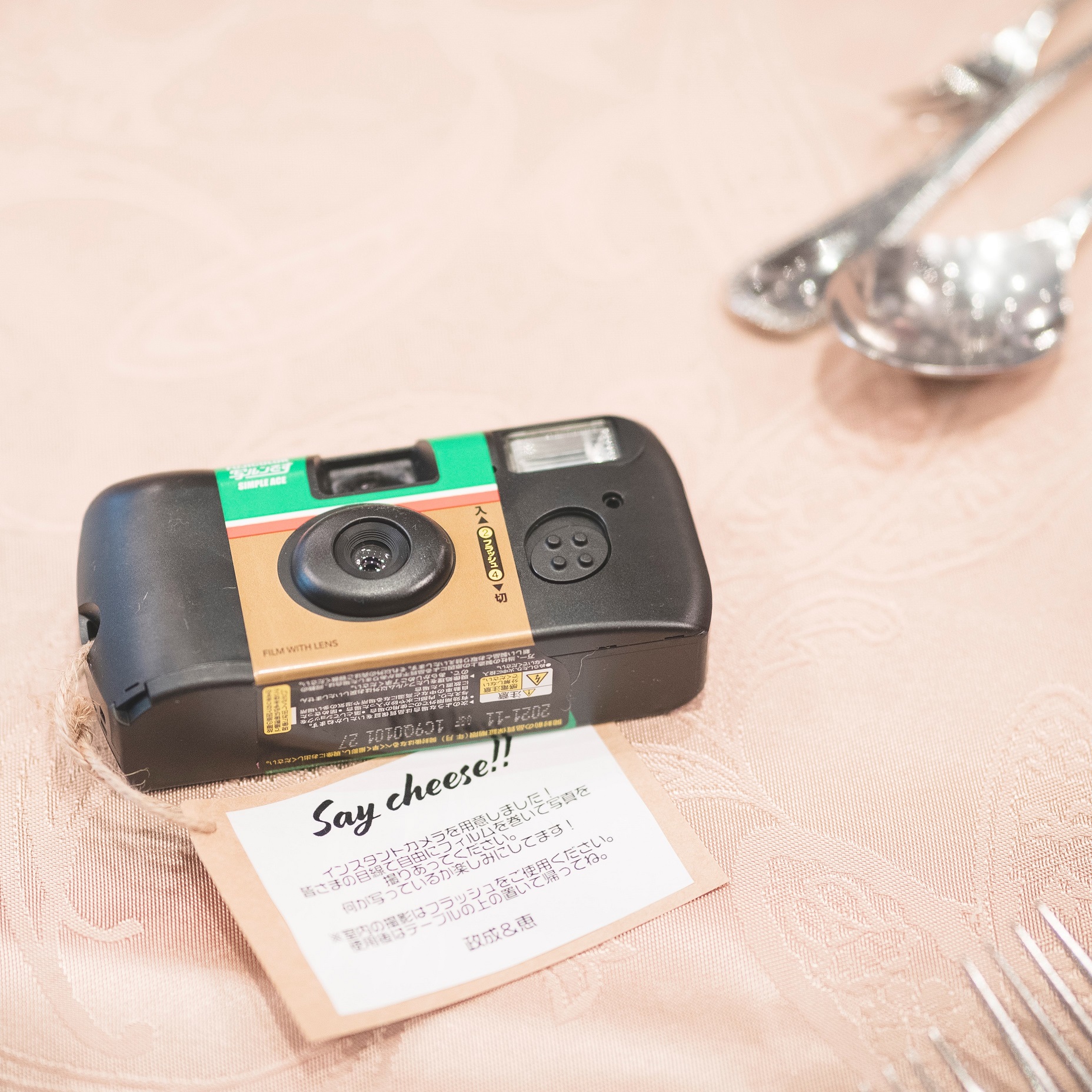 お色直し後の登場の際も新郎新婦愛用のフィルムカメラを構えてポーズをして登場した時は会場が湧いて皆さん喜んでいただき