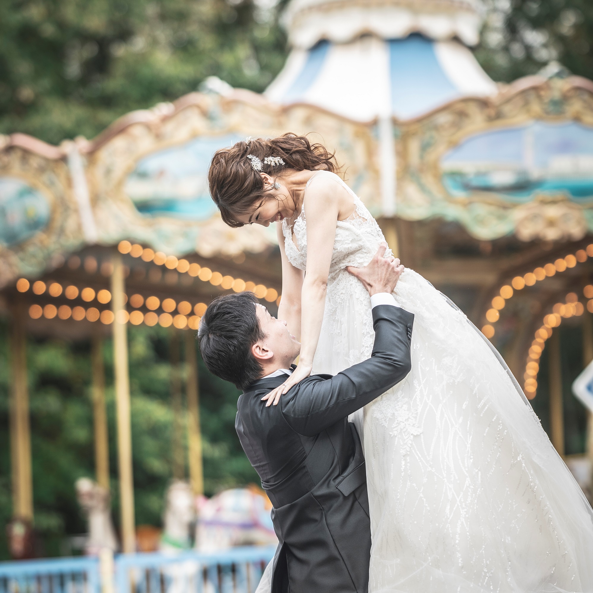 前撮りもしましたが、前撮りもメリーゴーランドでしたいという無理な要望にも応えてくださり、撮影できる場所を探してくれたり夢が叶って本当に嬉しいかったです!撮影もとっても楽しくて思い出に残る時間でした。