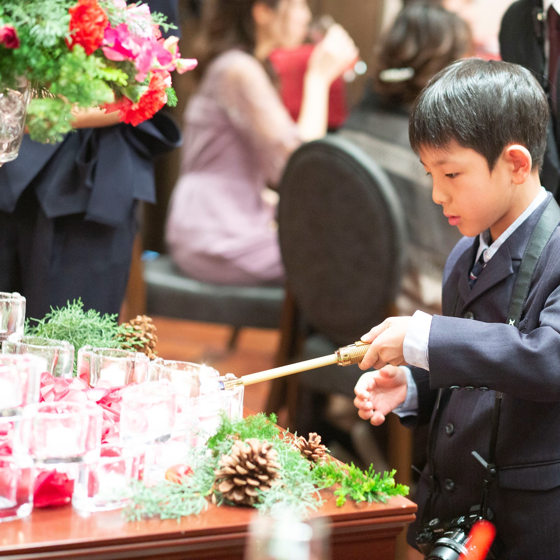 テーブルクロスの色を工夫したり、ポインセチアやダリアを多めに飾っていただき、松ぼっくりやキャンドルなどクリスマスをイメージした飾りつけにしていただきました!