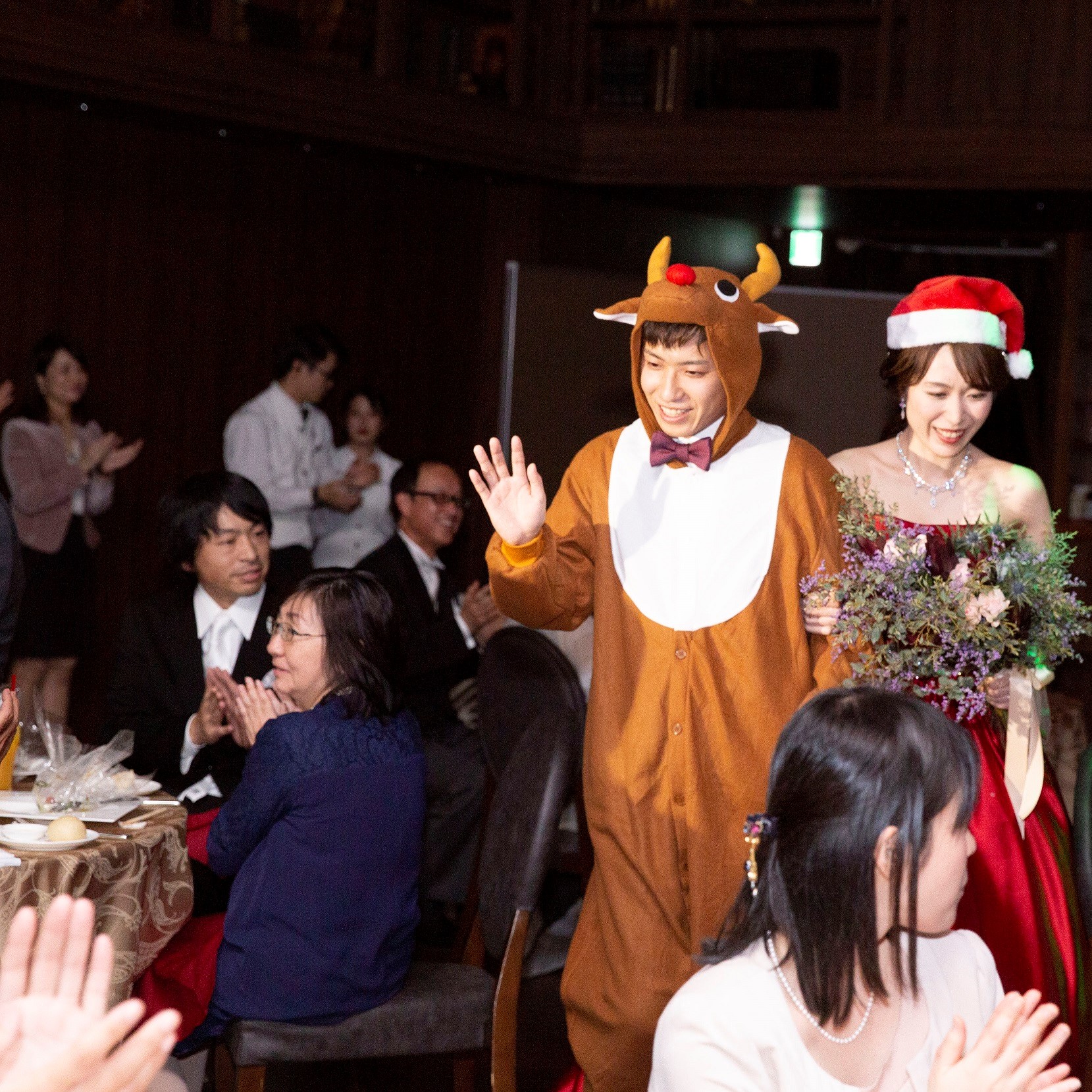 私たちのウエディングテーマは「感謝を伝えるクリスマスウエディング」ということで披露宴はクリスマスパーティーをイメージして、できるだけゲストの皆さんと距離が近く、ゲストの皆さんに楽しんでいただける披露宴になるよう意識しました!