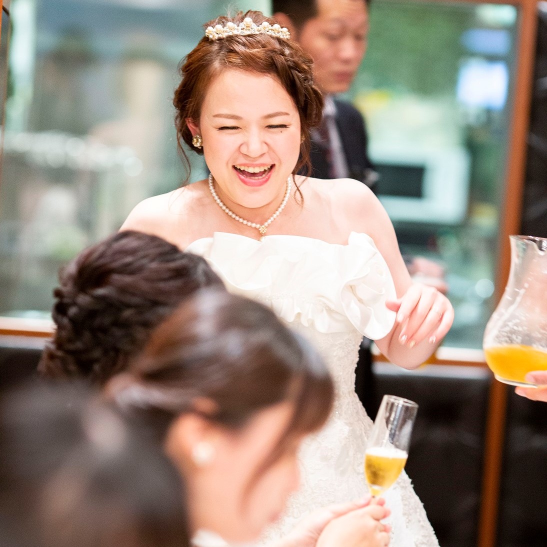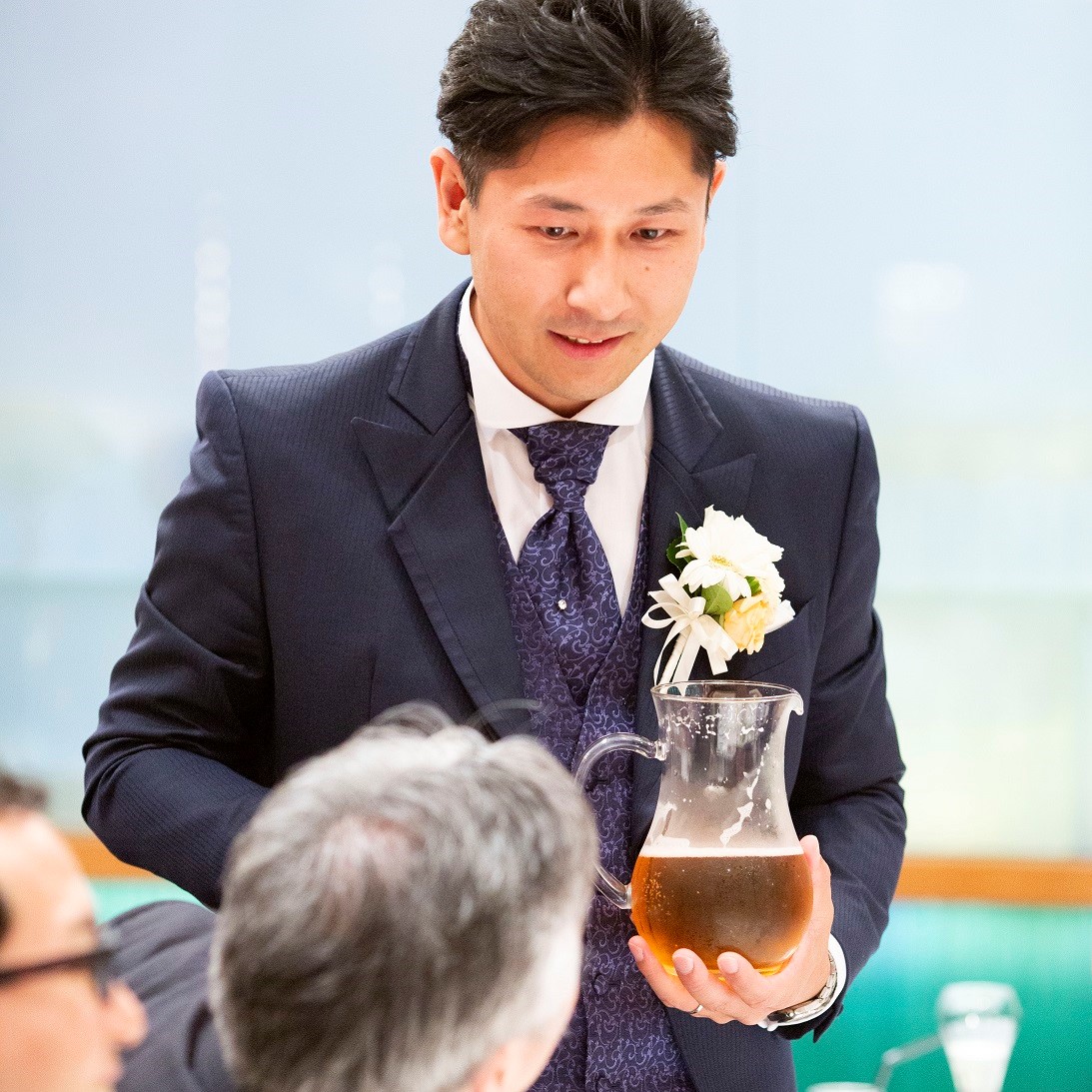 私達は、出席させていただいた式で、久々に新郎新婦と会ったのに全然話が出来なくて、寂しく思った経験がありました。そのため自分達は、スピーチやケーキカットなどはせず雛壇に居る時間を短くし、ゲストの方々の所へ行き、お酌をしたりゆっくり一人一人と話をしたり、写真を撮って周りました。