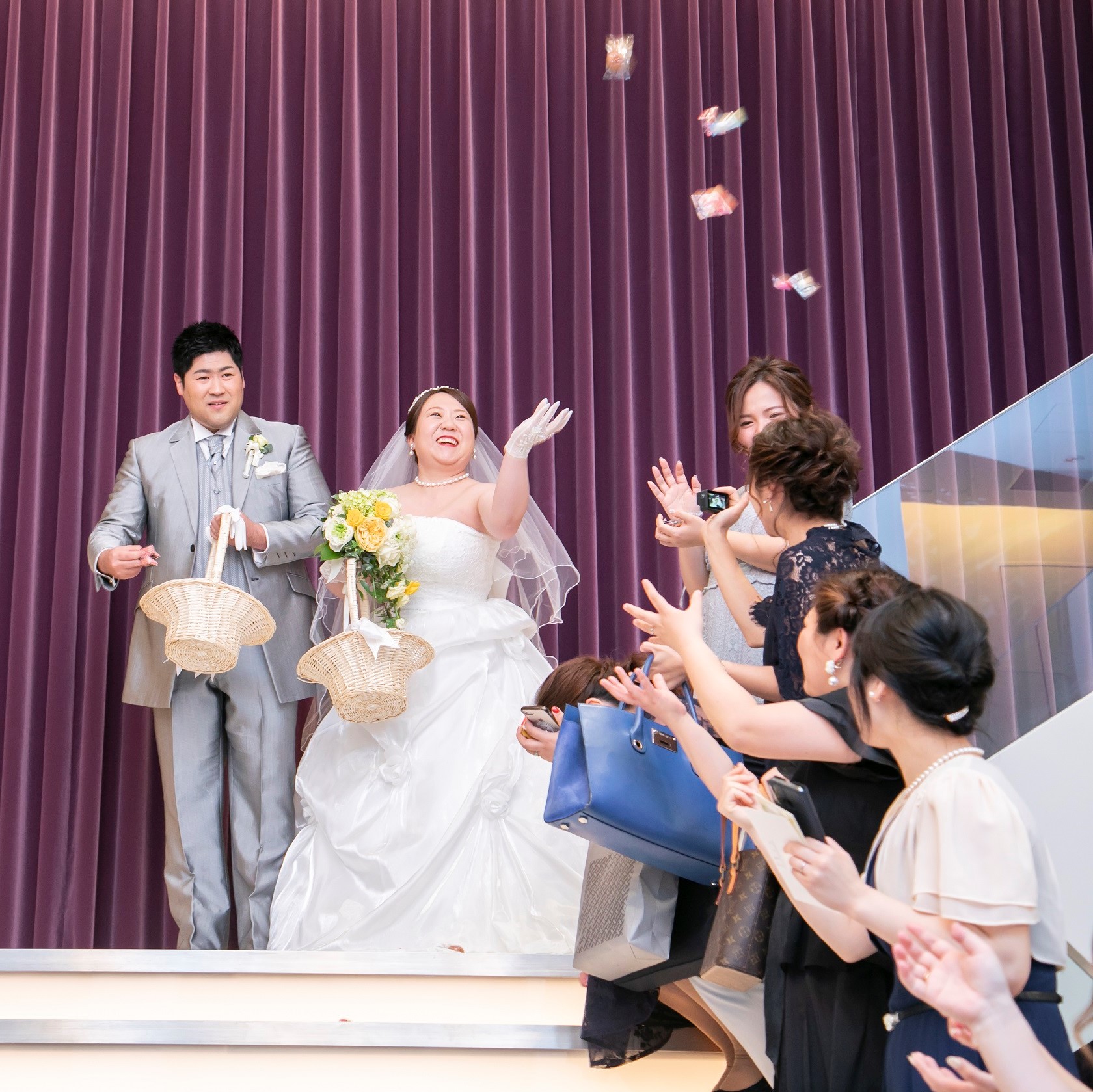 結婚式のテーマは『surprise!!!』でした。誰もしていないような演出や驚きを、来たゲストの方にプレゼントしたいと考えました。挙式後のアフターセレモニーでは階段上からお菓子まき、ブーケトスならぬひよこトスを行いました。某ラーメンでおなじみのひよこぬいぐるみをキャッチした人には、カノビアーノ特製の唐揚げをプレゼント!ゲストの方々にも大変好評でした。