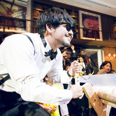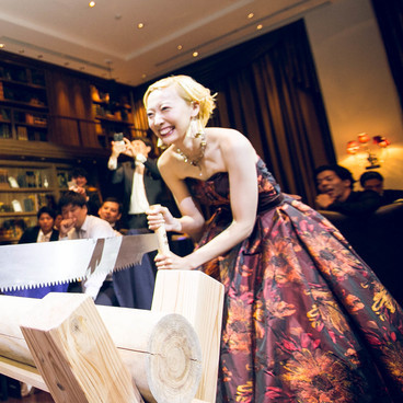 また、型にとらわれず、ゲストの方々が楽しめそうなことをやる!ということで、ケーキカットではなく丸太カット、キャンドルサービスではなくピストルサービス、友人代表スピーチではなくその場で数人にインタビューなど、新鮮なイベントを盛り込みました。