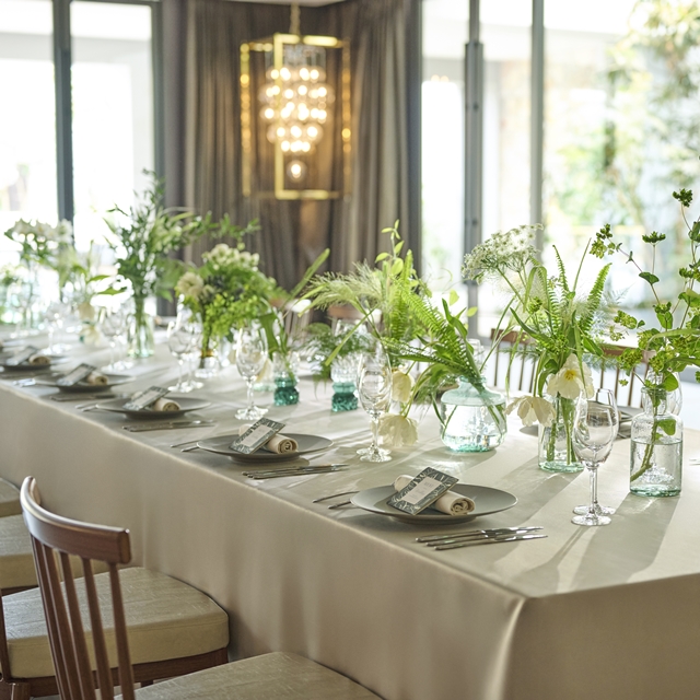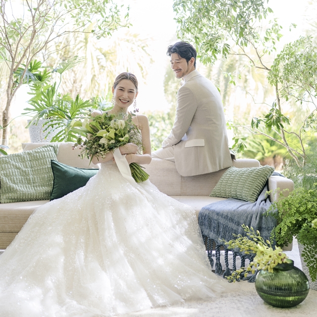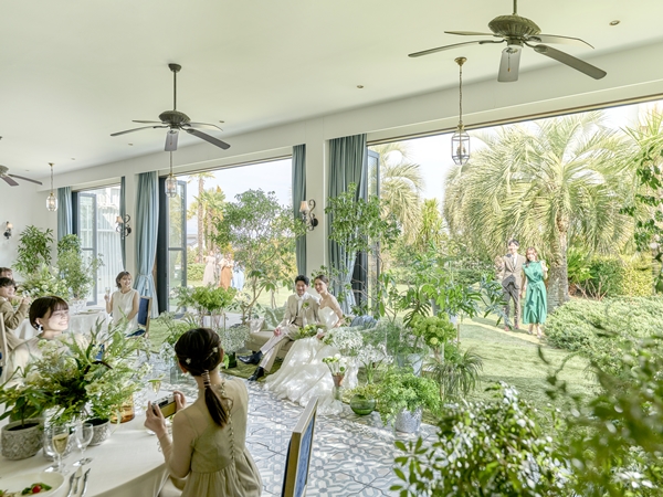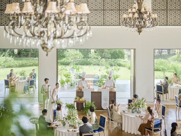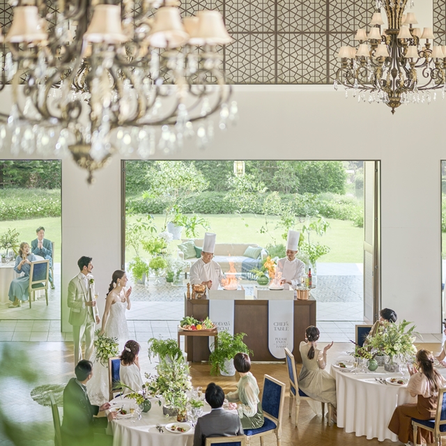 バンケットとひと繋がりになったテラスや、一面の窓の外に広がる緑豊かなガーデンでは多彩な演出が可能です。風を感じながらデザートビュッフェを愉しんだり、バーカウンターからのオリジナルカクテルで乾杯したりと、リゾート感あふれるおもてなしを形にしていただけます。おふたりらしいアイデアでゲストの皆さまと笑顔いっぱいの一日をお愉しみください。