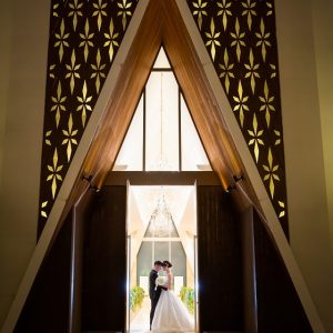 ディアステージのチャペルの特徴でもある三角屋根とおふたりを収めた一枚です。