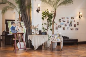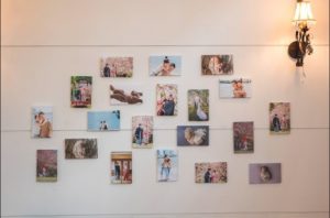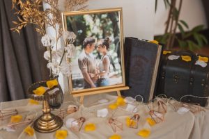 本や時計、箱を今までのお写真を一緒に飾ることで