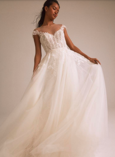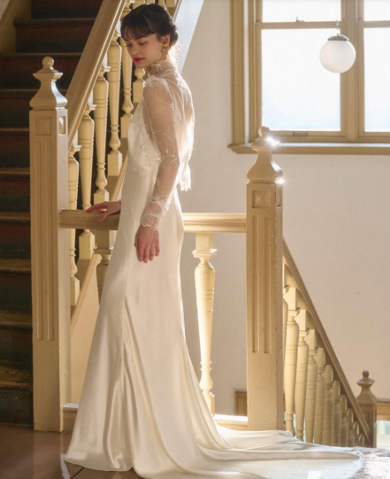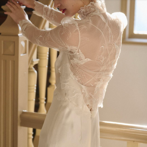 お袖とバックトレーンにはシアー感のあるチュールを使用することで