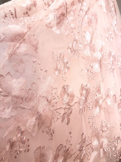 肌馴染みのいいブラッシュピンクに染めた総レースがロマンティックな1着。