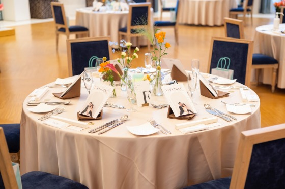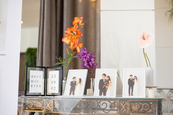 会場装花に合わせて、白黒のおしゃれな他のアイテムと