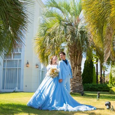 青い空の下での結婚式は自然光がたっぷり差し込み、