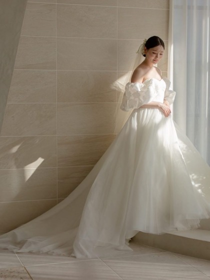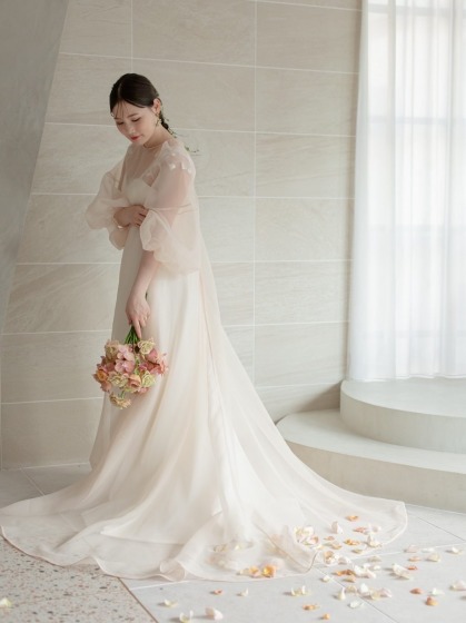 透明感のあるチュールをたっぷりと重ねたドリーミングな1着。
