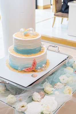 海の波や砂浜をイメージしたケーキに人形のヒレや泡を再現してあり、とってもかわいいです♡♡