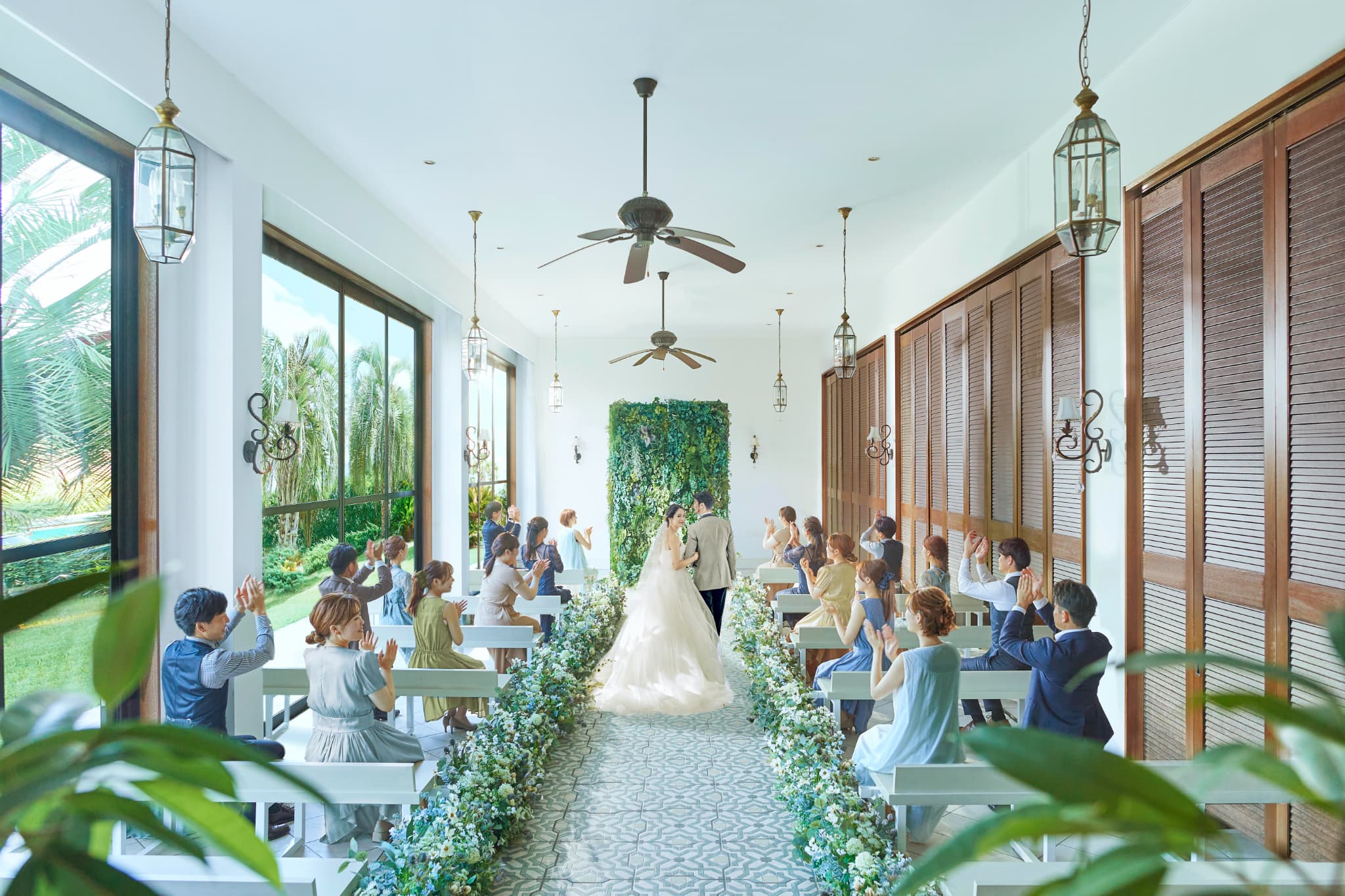ヤシの木や広大なガーデンが見えるテラスのような開放感のある新チャペル!