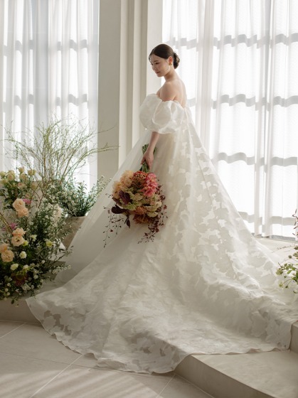 フラワージャガードを贅沢に使用し、大胆なバルーンスリーブをアクセントにしました。