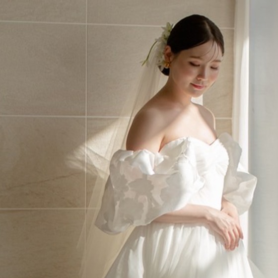 ボリュームたっぷりのスリーブや、フラワージャガードが華やかな印象なため
