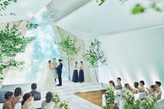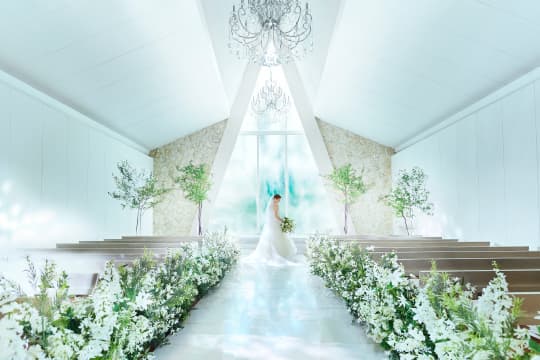 水と緑に彩られた中庭に佇む“フォレストブリーズチャペル”。扉を開くと、柔らかな自然光とシャンデリアの輝きに包まれた美しいステージが広がります。爽やかな緑がナチュラル感を添え、まるで海外リゾートのチャペルで執り行われるような特別感あふれるセレモニーを叶えていただけます。