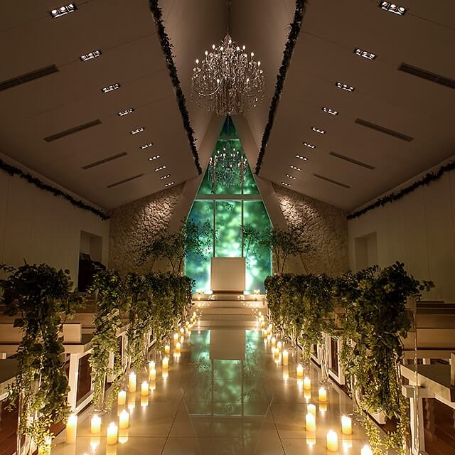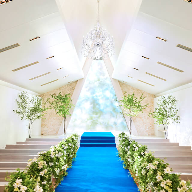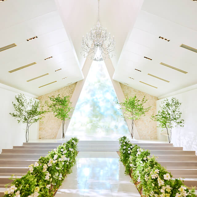 水と緑に彩られた中庭に佇む“フォレストブリーズチャペル”。扉を開くと、柔らかな自然光とシャンデリアの輝きに包まれた美しいステージが広がります。爽やかな緑がナチュラル感を添え、まるで海外リゾートのチャペルで執り行われるような特別感あふれるセレモニーを叶えていただけます。