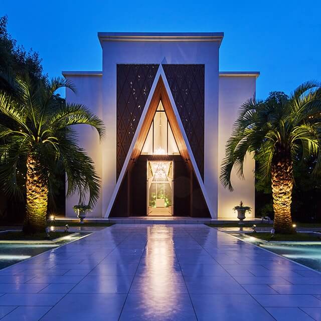 心地よい風が吹き抜け、明るく開放的な独立型チャペル。100名収容の広さを誇りながら、ゲストとの距離が近くに感じられる空間。エントランスからチャペルまで一直線に続くエターナルロードは未来に続く永遠なる道を表し、おふたりの幸せが続きますように、という願いを形にしています。