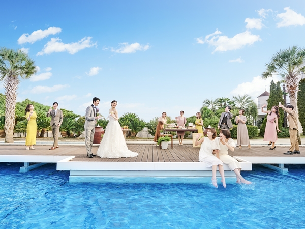 アフターセレモニーの舞台は、最高の笑顔になれるロケーションをご用意。水と緑がきらめくガーデンでは、真っ青な空までも貸切にしてフラワーシャワーやバルーンリリース、ブーケトス、ドロップ&フライなどお好みの演出をお愉しみいただけます。また、吹き抜けのロビーでの2階から優雅に舞い降りる花びらやフェザーシャワーの演出も人気です。