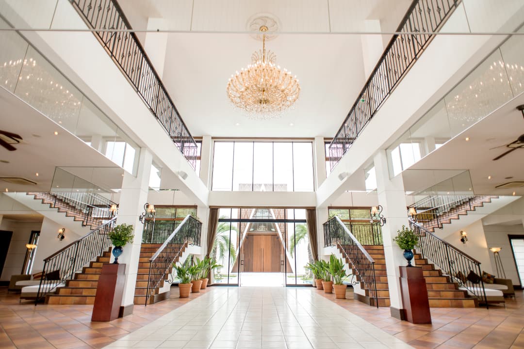 美しいシンメトリーに彩られたエントランスロビーは、海外の高級リゾートホテルを思わせる洗練の空間。自動ドアが一つもない館内は、「人の手で扉を開き、お祝いの言葉とともに皆さまをご案内したい」というおもてなしの心から設計されています。