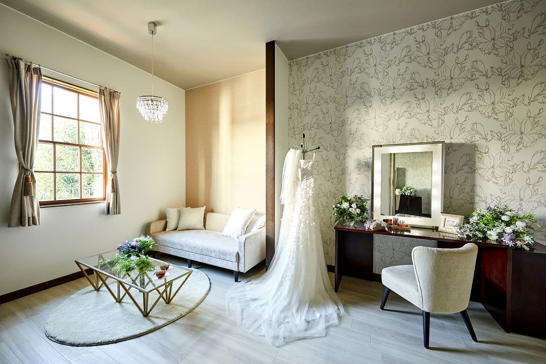 一生に一度、誰よりも美しく輝く日のお支度は、とっておきのプライベート空間で。窓から注ぐ柔らかな自然光と上品なインテリアが、当日の緊張を優しくほぐします。ご自宅のようにくつろいでお過ごしください。