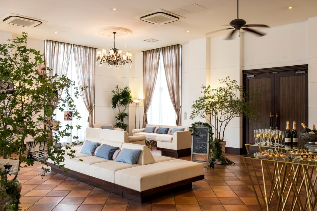 ゲストのためのラウンジは、プライベート感を大切にした心地よい空間です。バーカウンターもあり、ウエルカムドリンクを愉しみながら、ゆったりとくつろいでいただけます。