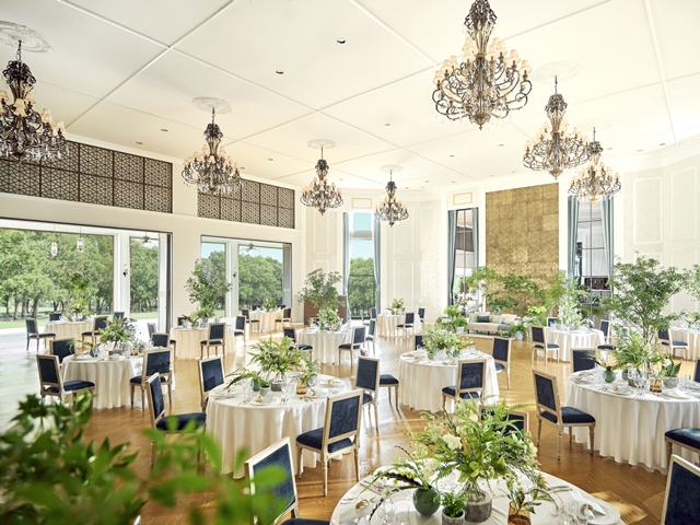 美しいシンメトリーに彩られたエントランスロビーは、海外の高級リゾートホテルを思わせる洗練の空間。自動ドアが一つもない館内は、「人の手で扉を開き、お祝いの言葉とともに皆さまをご案内したい」というおもてなしの心から設計されています。