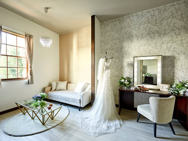 一生に一度、誰よりも美しく輝く日のお支度は、とっておきのプライベート空間で。窓から注ぐ柔らかな自然光と上品なインテリアが、当日の緊張を優しくほぐします。ご自宅のようにくつろいでお過ごしください。