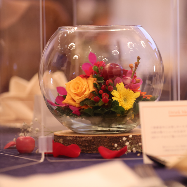 テーブル席の花やウエルカムスペースなどに大好きなキャラクターを連想させるような物をたくさん置きました。