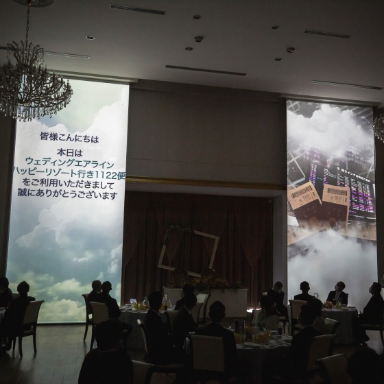 旅行や飛行機が大好きなので、その2つを取り入れ、映像担当さんの提案で新郎新婦の機内アナウンスが入ったオープニングムービーを作っていただきました。