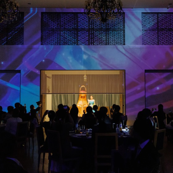 披露宴会場ではプロジェクションマッピングを使った演出に