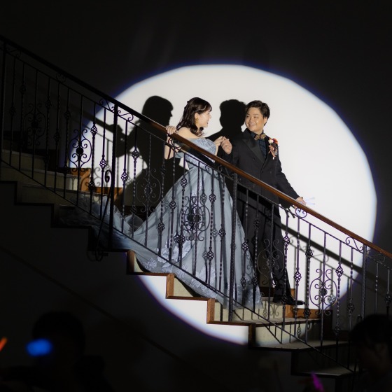 リングを運んでもらう演出にしたり、ケーキ入刀は二人羽織にしたり、