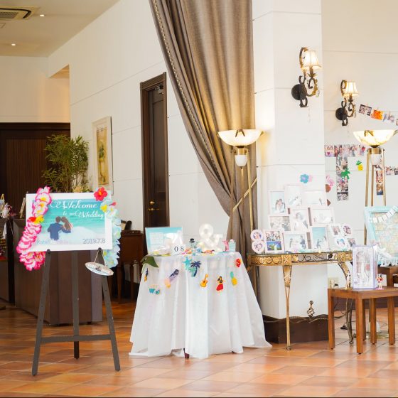当日は過ぎるのはあっという間でしたがとても濃厚で忘れられない一日となりました。沖縄+人気漫画の世界という私たちの好みを全体的に。料理も美味しい。会場も映像も凄い!などとゲストからの声も聞けて嬉しかったです。いきなりお願いしたのに、完璧にオープニング映像を作り上げてくださりプロは凄いなぁと思いました。何から何まで200%以上私たちの要望を叶えてくださいました。旦那からのサプライズや旦那へのサプライズなどお陰様で大成功しましたし、家族愛もより一層深まりました。会場見学から当日も色々なスタッフの方々に助けられ仲良くして下さり本当にありがとうございました。担当プランナーの百中さんにはとても助けられましたし沢山アドバイスを頂きました。お陰様で安心して当日を迎えることが出来ました。本当にありがとうございました!